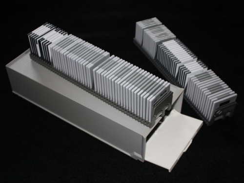 Es gibt aber auch andere Magazine, die nicht verwendet werden können. - Jegliche Arten von Aufbewahrungsboxen kann ebenfalls nicht direkt verwendet werden. Diese Dias müssen dann zum Scannen manuell umgeschichtet werden, was ggf. einen kleinen Aufschlag kostet.